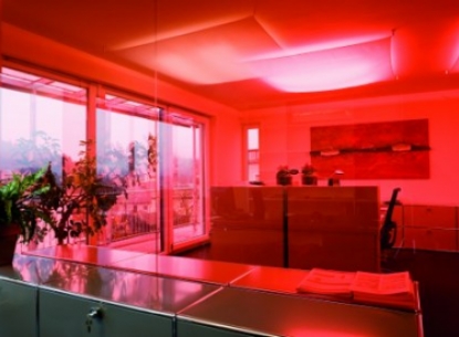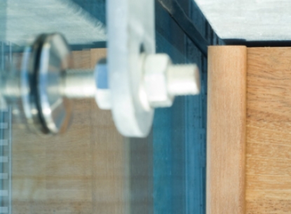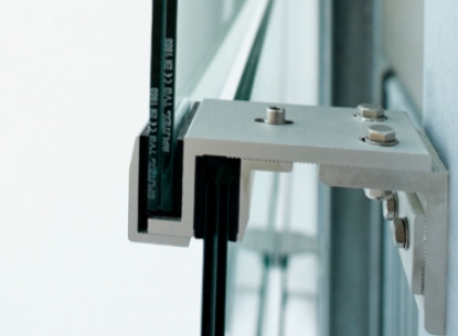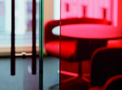 Spezielle Aufgaben – wie die Integration des Chefbüros im herkömmlichen Büroraum – verlangen eine spezielle Lösung. Das Verbundsicherheitsglas markiert eine transparente Grenze und das mit roter Folie verbundene Glas erzeugt eine exklusive Atmosphäre. Edelstahlkonstruktion und reduziert eingesetzte Beschläge überzeugen durch schlichte Klarheit.