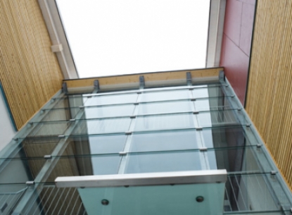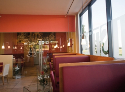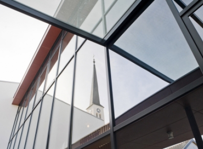 Innen und außen Akzente setzen. Die Verglasungselemente der Fassade bieten nicht nur zeitgemäßes Design, sondern auch modernste Funktionalität bezüglich Wärme und Dämmung. Die Glaswand im Innenbereich ist ein gelungenes gestalterisches Symbol für offene und transparente Kommunikation im Alltagsleben.