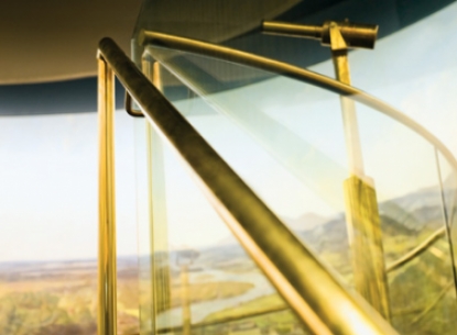 Maßarbeit für den Kulturgenuss. Die Adaptierungen bei Stiege und Bühne für das Sattler-Panorama sind von Meisterhand. Auch die Anpassungen beim kreisförmigen Geländer mit gebogenem Glas und edlem Handlauf überzeugen vollends. Die Spiegelsäulen geben dem Raum mehr Fülle, die zeitlos schönen Vitrinen beherbergen wertvolles Kulturgut – Bischofsstab und Schwert.